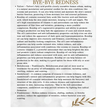 Typical skin redness can be brought on by stress or environmental factors. Tallow is naturally supple and melts into your skin without feeling greasy or sticky. With just a few applications of vitamin and mineral-filled tallow, we bet your skin—and confidence—will greatly improve. I suffer with redness on my face and sensitive skin. This does not irritate my temper-tantrum skin and makes my face as soft as a baby's.